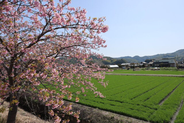 写真は近所の河津桜、そろってきた麦の緑と綺麗なコントラストでした。